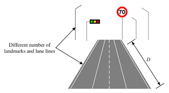 In summary, the localization accuracy is sensitive to feature distributions in a given scenario, and can be improved with an increased number of features as well as a larger distance from the vehicle to the reference landmarks. Through the analysis above, in order to achieve decimeter-level accuracy, four-line features—or three-line features and one additional point feature—are minimally required in the onboard camera vision. Of course, this minimal requirement can be easily fulfilled in general traffic scenarios.