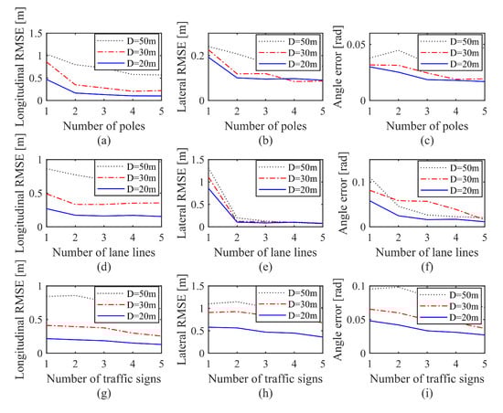 For this simulation, three constant light poles are set up as line features, and the impact of the number of traffic signs on the localization results is subsequently studied, as shown in Figure 10g–i. The result indicates clearly that the localization accuracy is much more sensitive to D than to the quantity of the traffic signs. In addition, by removing the lanes from the simulation scenario, the result of longitudinal localization is better than that of lateral localization. Compared to the previous simulation data, the line constraints indeed have a higher influence on vehicle localization than the point constraints.