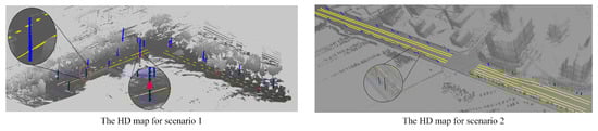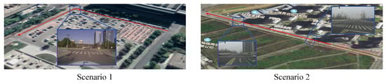 We conducted real vehicle tests in two typical scenarios with two intelligent vehicles. As shown in Figure 12, the first scenario is a campus scene, in which there are many vehicles parked on the roadside and landmarks such as light poles, traffic signs, etc. are dense. The track of the test vehicle is shown in the red line, which passes through two straight sections and one intersection. The second scene is a typical urban road. Compared with the first scene, there are more lane lines, and the distance between the poles is larger. During the experiment, the vehicle passed three straight roads and two intersections.