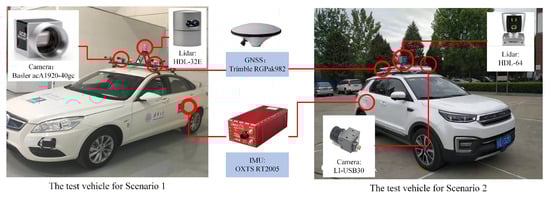 As shown in Figure 13, the test vehicle for Scenario 1 is equipped with a 32-line LiDAR and an integrated GNSS system for acquiring the HD map data and reference vehicle trajectory. A Basler industrial camera is used to acquire images for localization. The test vehicle for Scenario 2 is equipped with a 64-line LiDAR, an integrated GNSS system and a USB digital camera for localization validation. We equip each vehicle with a u-blox GPS module (not shown in the figure) with low precision as the initial value for the first frame localization. During each test, the GNSS signal is assumed absent, such that the localization is completed purely by the map and camera vision.