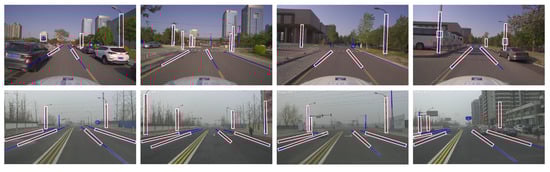 As shown in Figure 15, the vector HD maps used in the two scenarios are re-projected to the pixel coordinate system based on the localization results before applying frame-to-frame motion fusion in order to illustrate the map matching result more intuitively. Clearly, most of the map re-projection features (red) and the image-extracted semantic features (blue) overlap each other, thereby intuitively validating the effectiveness of the map matching algorithm of MLVHM. As far as feature recognition is concerned, we can see that based on depth learning, features are not affected by occlusion. For example, roadside vehicles or trees can block some light poles, but the rest can still be recognized and provide constraints in map matching.