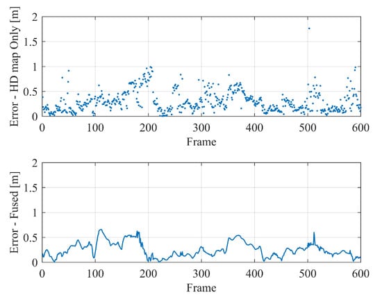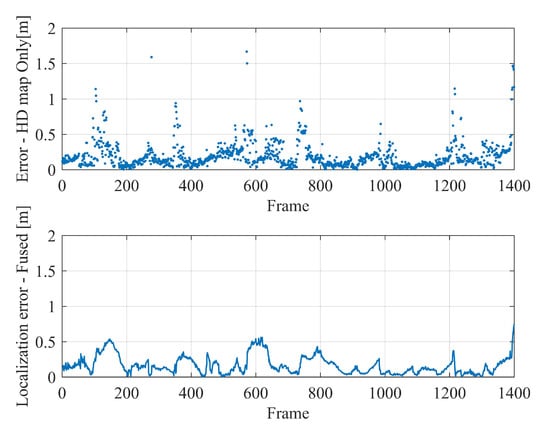 Vehicle localization results in the scenario 2—top: positioning errors of map-based localization; bottom: translation errors after fusing frame-to-frame constraints.