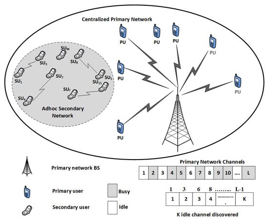 We considered an ad hoc cognitive radio network, where there was no central entity to govern the SUs. The SUs can access the idle portions of the spectrum and must leave the channel as PU becomes active on a channel, i.e., PUs hold the right to use the licensed spectrum. A set of SUs has M members and the set of PUs has N members as shown in Figure 1. The set of channels of the primary network has a cardinality of L, whereas, the set of vacant channels , i.e., channels available to the SUs have a varying cardinality of , where, , which depends on the load on the primary network. The detail list of notations used in this paper is presented in Table 1.