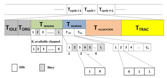 The CRN is considered a time-slotted system, where after the idle time , there are five phases: (i) organization (ii) sensing, (iii) sharing, (iv) allocation, and (v) transmission, as shown in Figure 2. An idle slot at the beginning provides synchronization among the SUs in an ad hoc CRN. After the synchronization, the SUs acquire their IDs in the range of 1 to system capacity in the organization phase as in [33]. The sensing of the spectrum to find spectrum holes is performed in . This information is shared among the SUs during the first sub-phase of sharing, i.e., . has sub-slots equal to the number of channels in the primary network. Each of these sub-slots in the has two bits. The first bit represents whether the channel has been sensed or not sensed and the second bit shows the channel state as busy or idle. If the first bit is 1, it indicates that the channel has been sensed by the SU while 0 shows channel has not sensed; the bit value 1 in second-bit position shows channel busy while 0 indicates the idle channel, as shown in Table 2. In the second sub-phase of the SUs share their channel utilization information among SUs. In this sub-phase there are slots. Every user uses the slot corresponding to its ID to share this information. In our simulations we have kept this value to be 3 bit however the size slot of can be adjusted according to the desired level of precision. These three bits of each sub-slot of sub-phase represent the channel utilization offered by respective SU. If all the three bits are one it indicates maximum channel utilization, i.e., 100% and when the value of these three bits is 0 then the channel utilization is below 40%. We divide this information into eight levels using the three-bit as shown in Table 3. The channel allocation is performed in using the Gale–Shapley algorithm. The actual utilization of the channel for data transmission is after the allocation of a channel to a SU, where it transmits the data in .
