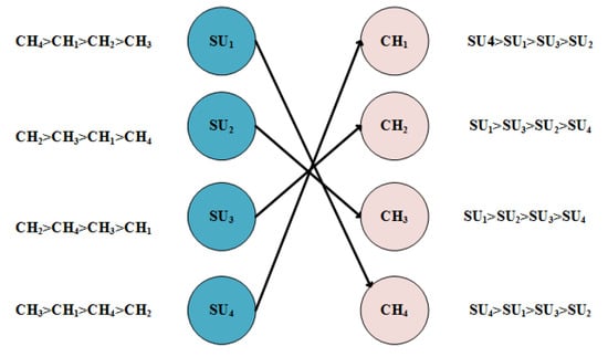 To elaborate the algorithm, consider a set of hypothetical preferences for SUs and channels. Table 4 shows the preference list of users and channels’ preferences are tabulated in Table 5; the users target the channel according to higher priority , , , and target , , , and , respectively; only is targeted by two users, so channel checks its preference list for accepting the proposal. is more favorable than as is higher on priority for channel. So accepts and rejects . At this stage, , and are engaged and only is still free. So, proposes to the next channel in its preference list, which is . As is already engaged to , it weighs both of its options—the new proposal and the one it is already engaged to. As per Table 5 of channel preference list, channels prefers over , so accepts the new proposal and breakdowns with . Now, is free, attempts for , which is already free, so its proposal is accepted straight away. This leads to a stable match as shown in Figure 4 , , , and .