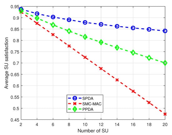 Figure 5 shows the average SU’s satisfaction with a different number of SUs in the CRN. The proposed SPDA shows a significant improvement in satisfaction compared to SMC-MAC and PPDA. SPDA outperforms both SMC-MAC and PPDA for the whole range of the number of SUs; however, performance improvement is significantly higher with a greater number of SUs in the CRN as depicted in Figure 5. When the number of SUs is 4, SPDA shows approximately 6% and 3% improvement as compared to the SMC-MAC allocation and PPDA respectively. As the number of SU is increased to 20, the SPDA gives approximately 36% and 14% higher satisfaction than the SMC-MAC and the PPDA respectively.