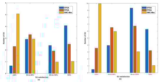 Figure 6 shows the number of SUs at different levels of SU satisfaction for two different cases (a) M = 10 in Figure 6a, (b) M = 20 in Figure 6b. In all three schemes, i.e., SMC-MAC, PPDA, and proposed SPDA, for the simulation there were 10 SUs in the CRN, seen in Figure 6a. The highest number of SUs get 100% satisfaction, i.e., getting its most preferred channel from the available pool of channels. Likewise, the number of SUs getting below the average channel is lowest for SPDA. With SMC-MAC, 50% of users get the above-average channel, with PPDA the percentage rises to 75% and with SPDA it is close to 94%. The sum of the individual number of SU is equal to 10. However, Figure 6b shows the similar results for 20 SUs.