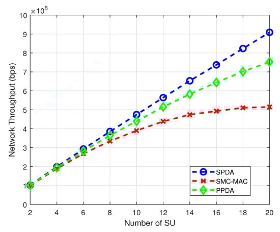The network throughput can be increased by optimally utilizing the channels according to the user requirements. Network throughput with variation in the number of SUs demonstrates in Figure 7. With an increasing number of SUs the network throughput also increases for all three schemes. However, for a large number of SUs the SPDA achieves much better network throughput than PPDA and SMC-MAC.