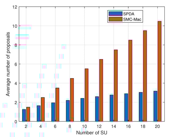 Average number of proposal with a varying number of SUs in cognitive radio networks (CRNs).