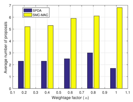 We have also analyzed the impact of weightage factor on the average number of proposals required before stabilization. In Figure 10, the varied from 0.2 to 1. A comparison with the SMC-MAC technique shows that our proposed SPDA algorithm remains better for any value of .