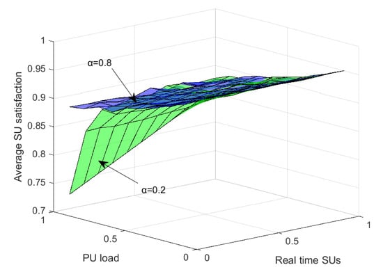 Average SU satisfaction at a different value of with variation in the PU load and real-time SUs.