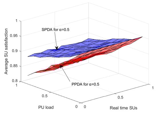 SPDA and PPDA average SU satisfaction with variation in PU load and real time SUs.