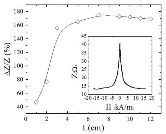 Giant magnetoimpedance (GMI) ratio as a function of the wire’s length. Inset: Z versus the applied magnetic field, H, for L = 3 cm, (fGMI = 300 kHz and Ipp = 19 mA).