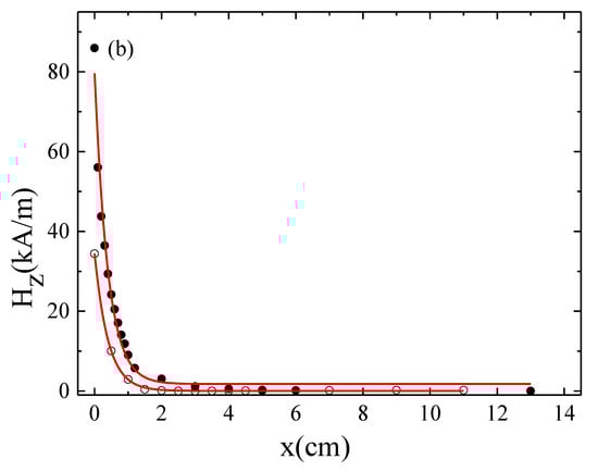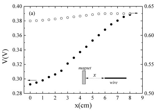 (a) GMI voltage, V, and (b) magnetic field, Hz, as a function of the relative distance, x, between the magnet and the GMI sensor (wire) for (●) the ferrite magnet and (o) the energy harvester. Inset in (a): schematic of the experimental configuration. The solid line in (b) represents the theoretical estimated field according to Equations (A2) and (A3) (Appendix A).