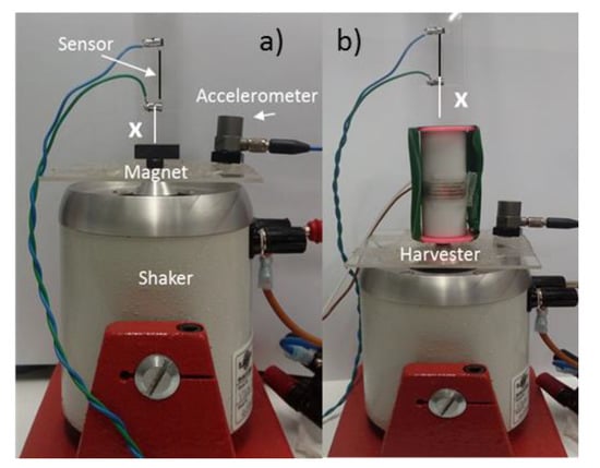 Experimental setup employed in the vibrating system (shaker): the accelerometer and the GMI sensor, (a) the ferrite magnet; (b) the harvester.