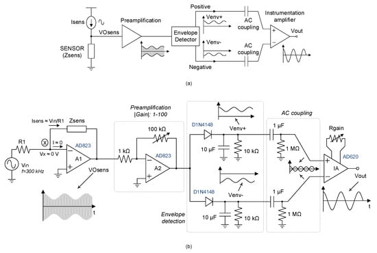 The general scheme of the design analog interface is shown in Figure 5 where (a) represents the underlying idea and (b) is its practical implementation. As can be seen, the wire sensor is excited with a sinusoidal signal, Vin (fGMI = 300 kHz) and the resistor value R1 was properly chosen to operate under optimal GMI conditions (Isens = Ipp = 19 mA). Due to the periodic changes in Hz, the amplitude of the enveloping signal, V0sens, (V0sens = −Isens.Z) depends on the extreme values (minimum and maximum) of Z during vibration, or, in other words, on the difference of maximum and minimum Hz acting on the sensor. To detect the modulation depth of V0sens signal, a double passive envelope detector (positive and negative) was employed [41]. The resulting signals Venv+ and Venv- were AC coupled to an instrumentation amplifier AD620 in order to obtain the signal Vout, which was proportional to the differential envelope of V0sens.