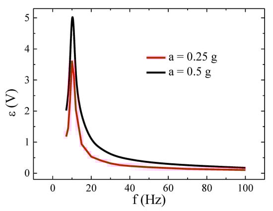 Induced emf, ε, in the harvester as a function of vibrating frequency for the accelerations: a = 0.5 g and a = 0.25 g.