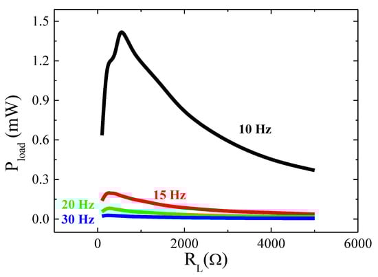 Firstly, the energy harvester was characterized and the induced emf, ε, evaluated as a function of the vibration frequency, f, in an open circuit for the accelerations of a = 0.25 and 0.5 g (peak value, measured through the commercial accelerometer). As Figure 6 shows a resonance frequency fres ≈ 10 Hz was obtained, characterized by a maximum value in ε. Afterward, the electrical power, , generated by the energy harvester was analyzed as a function of the external resistive load, Rl, connected to the coil for different frequencies and at a constant vibration acceleration amplitude a = 0.5 g. values were estimated through the expression, , where Vload is the voltage measured in the load resistance. As can be seen in Figure 7, a maximum in Pload was observed for RL = 500 Ω at the resonance frequency. A sharp decrease in Pload was obtained for higher vibration frequencies irrespectively of the load resistance. Similar values (≈mW) of the generated electrical power have been reported in the literature for equivalent vibrational harvesters [18]. As an example, values of 1.53 mW (f = 20 Hz and a = 0.4 g) and 0.74 mW (f = 16 Hz and a = 0.4 g) were obtained in [42,43] but at much higher loads, 200 and 55 kΩ respectively.