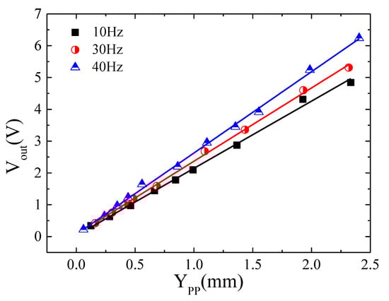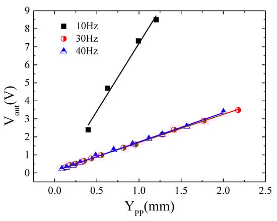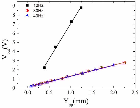 Comparatively, Figure 9 and Figure 10 show Vout versus Ypp for the harvester in the two cases, keeping the GMI sensor at rest and fixed to the vibrating platform of the shaker, respectively (see Figure 4). It is important to note that while in the first analyzed configuration, the distance x between the harvester frame and GMI is time dependent, in the second case it is constant, so only the relative movement of the magnetic inertial mass is registered. In both cases, a linear response is obtained for the three analyzed vibration frequencies with maximum sensitivity at the resonance frequency: G = 7.70 ± 0.03 (f = 10 Hz) for the sensor at rest and G = 7.5 ± 0.6 (f = 10 Hz) when it is attached to the vibration platform. Off-resonance, the sensitivity values were also similar for both configurations: G = 1.19 ± 0.02 (f = 30 Hz), 1.20 ± 0.01 (f = 40 Hz) V/mm for the sensor at rest and G = 1.56 ± 0.01 (f = 30 Hz), 1.62 ± 0.02 (f = 40 Hz) V/mm for the sensor vibrating with the vibrating platform. The similarity of the G values under both configurations indicates that the magnet inertial mass (M2-M3) mainly dominates the changes of the magnetic field outside the harvester. Nevertheless, off-resonance, slightly lower sensitivity values were registered when the sensor was fixed at rest. This fact can be explained in terms of the slightly different magnetic field acting on the sensor in each configuration. When the sensor vibrated with the vibration platform, the magnetic field acting on the wire is only due to the inertial mass. However, when the sensor is fixed at rest, the contribution of the magnetic field of the upper magnet in the frame should be taken into account (changes in x). Since both magnetic fields have opposite senses (see Figure 1a), the net strength of the effective magnetic field is slightly lower intense for the same amplitude of vibration Ypp, leading to lower output signal Vout. This effect at resonance is negligible because of the higher amplitude of vibration described by inertial mass.