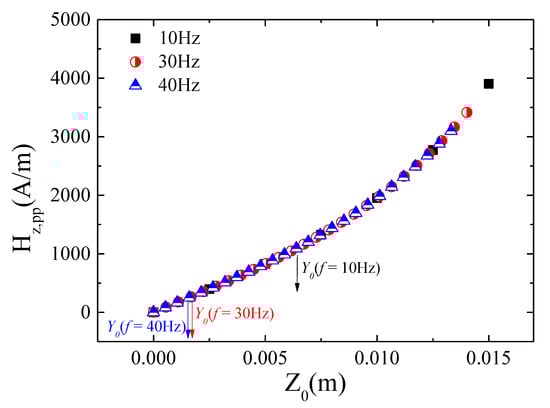 Furthermore, a linear relationship was also found in Vout versus the amplitude of vibration for the harvester under both analyzed situations (sensor at rest or fixed to the vibrating platform; see Figure 9 and Figure 10). This linear response supports again the linear relationship between the small vibration amplitudes (in this case of the inertial mass) and the variation of the effective magnetic field acting on the GMI sensor. Figure 11 shows the estimated magnetic field amplitude, Hzpp; namely, the effective peak to peak value of the magnetic field (Hmax − Hmin)—see Appendix A—as a function of the inertial mass displacement amplitude, Z0. As described in Appendix A, the estimation of Hzpp is performed employing the analytical expression for the magnetic field of a cylindrical magnet (Equation (A1)) and the superposition principle of the magnetic field generated by the set of magnets (M1, M2, M3 and M4) in the harvesters (Equation (A4)), assuming only the initial magnet under vibration. Additionally, the displacement amplitude values (Z0) are obtained through Equation (4), considering ζ = ζp = 0.1 (open coil). So, as it is shown in Figure 11, even the maximum displacements of (see also Figure S1) take place in a region where Hzpp depends linearly on Z0, justifying the linear experimental response of the GMI sensor under the vibration of the inertial mass of the harvester.
