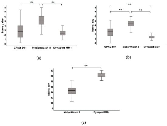 Box-plot illustration of German Physical Activity Questionnaire 50+, MotionWatch8 and MoveMonitor+ derived total duration [hour/day] of physical activity intensity and sedentariness: (a) moderate to vigorous intensity (Friedman-test with Bonferroni post-hoc test); (b) light intensity (repeated measurement analysis of variance with Bonferroni post-hoc test); and, (c) sedentariness (t-test for paired samples). ** p ≤ 0.01.