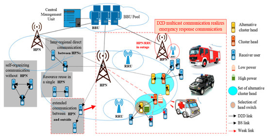 D2D communications is a technology that allows the terminals to communicate directly through multiplexing the cell resources. As shown in Figure 1, the H-CRAN architecture is composed of HPN, RRU, Base Band Unit (BBU), and Central Management Unit (CMU). All resource is regulated uniformly by CMU in the BBU pool. The CMU can allocate resources directly without considering the details of the connection. D2D technology can implement the following types of communications in 5G PSN: resource reuse in a single HPN, inter-regional direct communications between HPNs, self-organizing communications without HPN, and extended communications between HPN coverage and the outside [23]. The advantages of D2D are as follows: high speed and low latency, efficient resource utilization, ease congestion and reduce network transmission load, coverage extension, and so on. Under the characteristics of resource sharing and centralized allocation of H-CRAN, it is hoped that the extended coverage function of D2D can compensate the users with outages. Finally, emergency communications based on D2D multicast are realized.