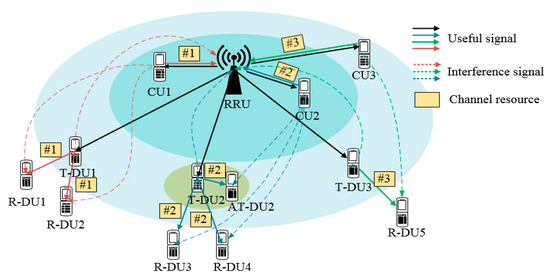 The PSN channel resources are limited. Multiplexing the uplink channel of the CU can reduce the resource pressure. In order to ensure the fairness of channel resource allocation, we assume that each D2D cluster can only reuse one channel and one channel can only be multiplexed by only one D2D cluster. As shown in Figure 2, the T-DU1 multiplexes the data of R-DU1 and R-DU2 with the channel #1 resource of CU1. In addition, the T-DU2 multiplexes the uplink channel #2 resource of CU2. In addition, The T-DU3 is multiplexed with the uplink channel #3 resource of CU3. Due to the multiplexing of uplink resources, the T-DU interferes the HPN/RRU. At the same time, CU interferes the R-DUs.