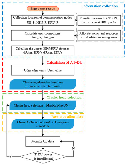 The process of emergency communications based on throughput-aware D2D multicasting in 5G PSN is shown in Figure 3. The sustainable D2D emergency communications mechanism is divided into four steps: information collection, calculation of AT-DU, T-DU selection, and resource allocation. First, UE information is collected, including all UEs in the coverage area of the HPN/RRU and adjacent outage area. The filtered UEs who are close to the adjacent HPN/RRU can expand the coverage. So the 30% edge UEs are selected to be clustered according to the geographical location. Then, AT-DU is selected according to a cluster head selection scheme as far as possible to ensure that there are enough AT-DUs to be selected to maintain communications. Next, the cluster head selection mechanism is used to select the appropriate user in the AT-DUs as the T-DU. Among the edge users without AT-DU, the T-DU should also be found. Finally, CU channel multiplexing is selected by the Hungarian algorithm. As the communications continue, the UE data are changing, including T-DU power and UE location information. When the current T-DU power is insufficient, the next AT-DU is searched to serve as T-DU.