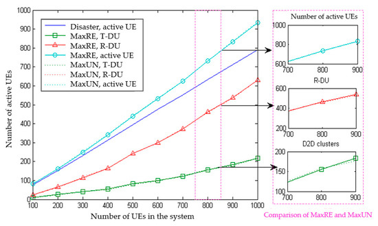 - In terms of the overall trend, the D2D emergency measures have greatly improved the user active status in the network. There is no obvious difference between the MaxRE and MaxUN cluster head selection methods.