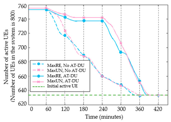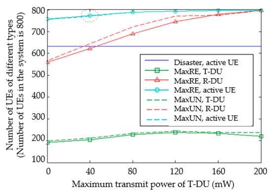 The maximum transmit power of the UE is set to 40 mW. The number of users of D2D continuous communications is observed with time as shown in Figure 7. The abscissa is the analog communications time unit T. The power consumption of the T-DU is large. In addition, its power is gradually reduced to the critical point. The dotted line in the figure indicates the D2D transmission performed by MaxRE and MaxUN without AT-DU. The solid line indicates the schemes with the AT-DU. At T = 60, the T-DU starts to turn into the R-DU due to insufficient remaining power. As a result, the number of users accessing the network begins to decline. During T = 180–240, the solid lines stabilize again due to the role of the AT-DU. At T = 240, the number of active users of all schemes decrease continuously. Only a small number of users with multiple AT-DU maintain continuous transmission. Until T = 380, none of the users have enough power to be a T-DU. In addition, the number of active users returns to the original state. The setting of the AT-DU greatly prolongs the time for users to communicate continuously. In addition, it guarantees the communications situation of most users before the disaster reconstruction.