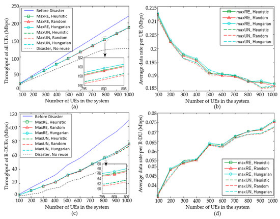 Values of throughput and average data rate per UE in the system are compared in Figure 8a,b. Figure 8c,d compare these values of R-DUs. It can be seen that the gap is gradually increased between the throughput of D2D multicast transmission with resource reuse and that before the disaster. When the number of users is 800, the throughput is nearly 25 Mbps, which is less than before outage. Compared with the no reused D2D compensation strategy, the advantage of reuse also increases gradually. This is on the account of allowing more users to successfully connect to the network by resource reuse. Different algorithms and cluster head selection schemes are compared after amplification. It can be seen that the throughput of MaxRE is 1.3% higher than MaxUN. The results of Hungarian algorithm are better than a heuristic algorithm, and the heuristic algorithm is better than the random one. The best one of “MaxRE, Hungarian” is 1.9% higher than that of the “MaxUN, Random”. In addition, the average data rate per UE decreases gradually as the number of users increases. When the number of users was 800, it was down 12.2% from 100 users. This is due to the interference caused by a reuse channel. When the total number of users increases, the proportion of users reused also increases. The number of users with interference increases, and the average data rate decreases. It can be seen that the throughput of the MaxRE is higher than MaxUN. The results of the Hungarian algorithm are better than a heuristic algorithm, and the heuristic algorithm is better than the random one.