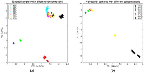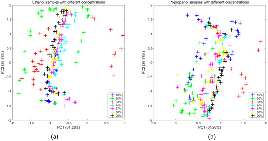 Projections of the two first primary components of the PCA computed for the two new feature datasets which were transformed from the original data by the MICF.: (a) ethanol and (b) n-propanol.