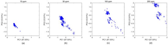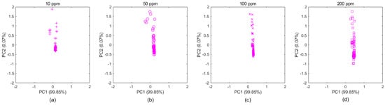 Example of the new data transformed by the Maximum Independence of the Concentration Features (MICF) in Batch 10. The Figure 5a–d show that the new ethylene data, transformed from the original data by the MICF, is projected into two dimensional subspaces, whose basis is two principal components computed by PCA. The drift interference caused by concentration was suppressed, so the data distributions tended to be consistent.