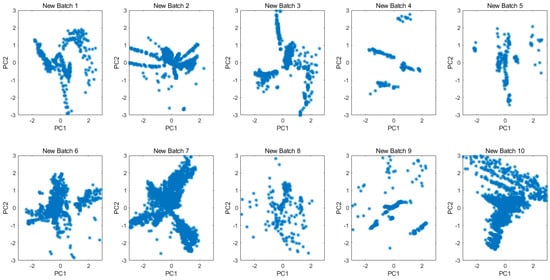 Not limited to the gas concentrations or the samples kinds, the projected 2D subspace for all original data in each batch is shown in Figure 6. The drift is clearly demonstrated by the different data distributions among batches. Figure 7 shows the principal component space of 10 batches for all new data which were transformed from original measurements by the MICF. The results of the data distribution were not as good as we expected, because the MICF-based model is poor at solving the problem of long-term gas measurement. It is necessary to consider the interference of the long-term drift of sensors. In order to solve the long-term drift of sensor, we proposed the IFLD-based model, and combined it with the MICF-based model to further improve the accuracy in the gas classification task. The long-term drift will be overcome based on the IFLD during the classification model training.