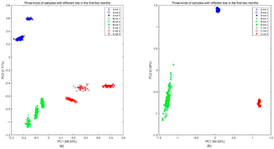 The 45 samples in Batch 1 were analyzed by PCA, as shown in Figure 8a, and the scatters clearly displayed the distribution difference over kinds and lots. From the plot, it was found that while different kinds of samples were clustered in different regions, the distribution of samples with different lots in the same category were still slightly different. For manufacturers and consumers, the difference between different lots should be ignored. By extracting new features that are independent of lots using the MICF, it was obvious that the distributions of the different kinds of samples tended to be separable, and the distributions of the different lots tended to be uniform, which was shown in Figure 8b.