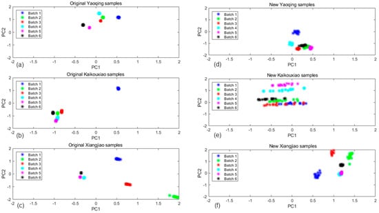 Projections of the two first primary components of the PCA computed for original data and new data which were transformed by the MICF: (a) original Yaoqing samples data, (b) original Kaikouxiao samples data, (c) original Xiangjiao samples data, (d) new Yaoqing samples data, (e) new Kaikouxiao samples data, and (f) new Xiangjiao samples data.