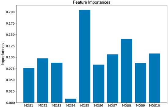 The contribution rate of each sensor in the E-nose in the classification task is shown in Figure 10, from which we can see that the fifth MOS sensor has the largest contribution for distinguishing those three types of liquors.