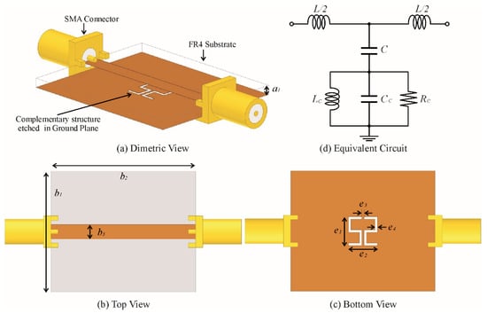 (a) Sensor design based on FR4 epoxy substrate (a1 = 1.6 mm). (b) Top view of sensor (b1 = 25 mm, b2 = 30 mm, b3 = 3 mm). (c) Bottom view of sensor (e1 = e2 = 6 mm, e3 = e4 = 0.5 mm). (d) Equivalent circuit model with L and C for the unit length inductance and capacitance of the microstrip transmission line respectively and (RLC)C for the complementary symmetric S-shaped resonator (CSSSR).