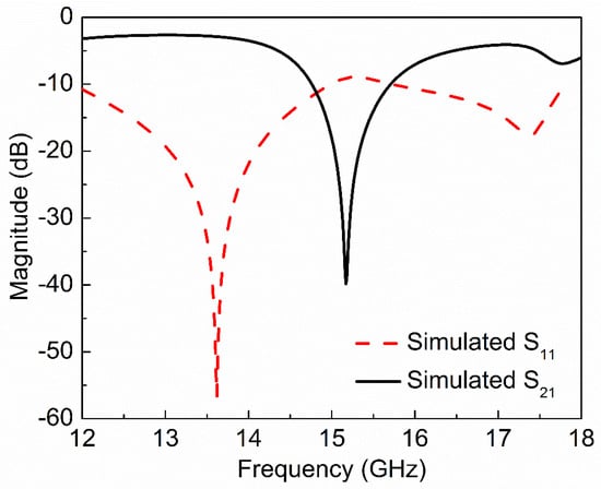 The 3D model of the proposed sensor is simulated in ANSYS HFSS software with the simulation conditions given in ref. [58]. The proposed sensor shows a resonance at 15.17 GHz with notch depth of –39.84 dB as shown in Figure 2. The unloaded quality factor of the proposed sensor is 505 which can be calculated by the following relation [62]: