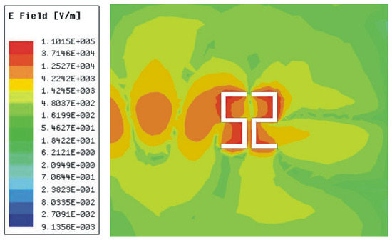 Magnitude of electric field at the resonance frequency of the proposed sensor. The electric field is concentrated at the edges of the CSSSR and its maximum value is 1.10 x 105 V/m.