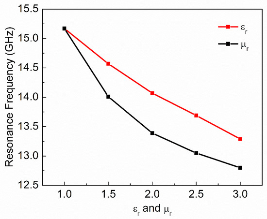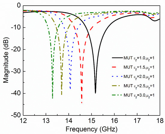 where and are real and imaginary parts of complex permittivity respectively. and are real and imaginary parts of complex permeability, respectively. and are dielectric and magnetic loss tangent, respectively. Natural materials are usually characterized by real relative permittivity with and real relative permeability with with at specific frequencies. Now these four parameters () of MUT are used to check the sensitivity of the proposed sensor. The other parameters like langde G factor = 2, bulk conductivity = 0 siemens/m, magnetic saturation = 0 tesla, mass density = 1.1614 kg/m3 are the same for all the MUTs. First, of MUT is varied from 1 to 3 keeping other parameters constant as given in Table 2 and the effect of on the transmission coefficient of the sensor is plotted in Figure 5. According to simulated results, as of MUT increases from 1 to 3, the f0 decreases from 15.17 GHz to 13.29 GHz while notch depth increases from −39.84 dB to −42.32 dB. Second, of MUT is varied from 1 to 3 keeping other parameters constant as given in Table 3 and the effect of on the transmission coefficient of the sensor is plotted in Figure 6. According to simulated results, as of MUT increases from 1 to 3, the f0 decreases from 15.17 GHz to 12.80 GHz and notch depth also decreases from −39.84 dB to −32.32 dB. Third, of MUT is varied from 0 to 0.4 keeping other parameters constant as given in Table 4 and the effect of on the transmission coefficient of the sensor is plotted in Figure 7. According to simulated results, as of MUT increases from 0 to 0.4, the f0 increases from 15.17 GHz to 15.28 GHz and notch depth decreases from −39.84 dB to −12.96 dB. Fourth, of MUT is varied from 0 to 0.4 keeping other parameters constant as given in Table 5 and the effect of on the transmission coefficient of the sensor is plotted in Figure 8. According to simulated results, as of MUT increases from 0 to 0.4, the f0 increases from 15.17 GHz to 15.30 GHz and notch depth decreases from −39.84 dB to −8.08 dB. These simulated results show that and affect the resonance frequency of the sensor as shown in Figure 9. While and affect the notch depth of the sensor as shown in Figure 10. However, all these factors do not have the same effect on resonance frequency and notch depth which means that we can distinguish the effect of each factor individually using the proposed sensor.