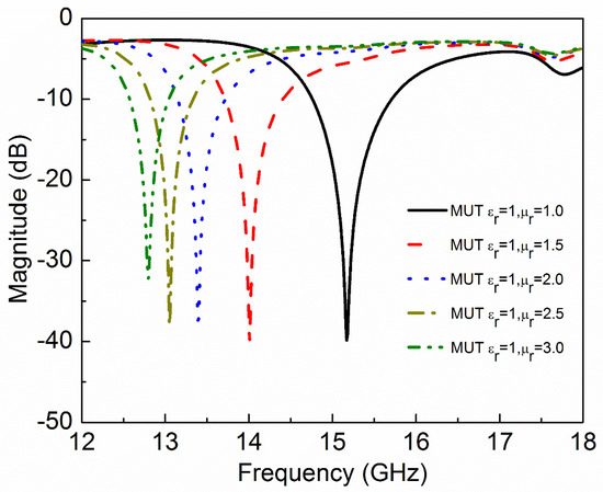 Simulated transmission coefficient (S21) of the sensor due to interaction with the MUT with different values of permeability (µr). As the relative permeability of MUT increases, the resonance frequency decreases.