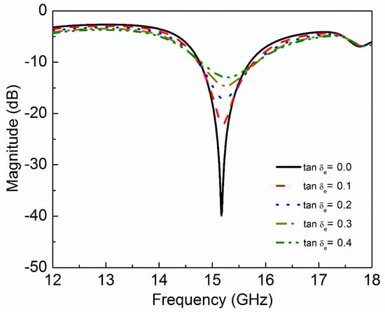 Simulated transmission coefficient (S21) of the sensor due to interaction with the MUT with different values of dielectric loss tangent (tanδe).
