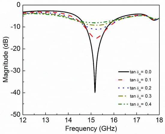 Simulated transmission coefficient (S21) of the sensor due to interaction with the MUT with different values of magnetic loss tangent (tanδm).