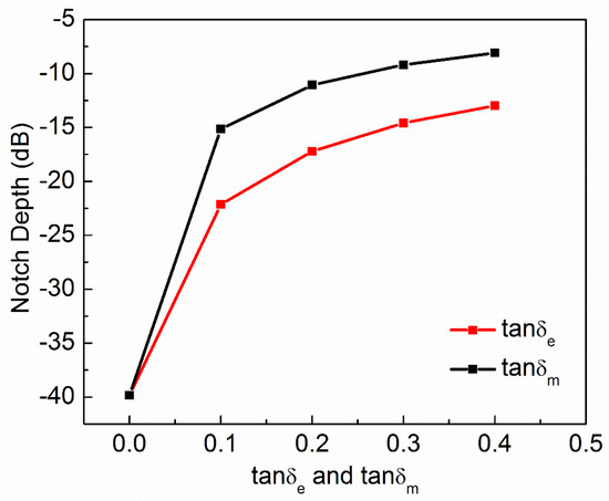 Dielectric loss tangent and magnetic loss tangent of MUT versus notch depth of the sensor.