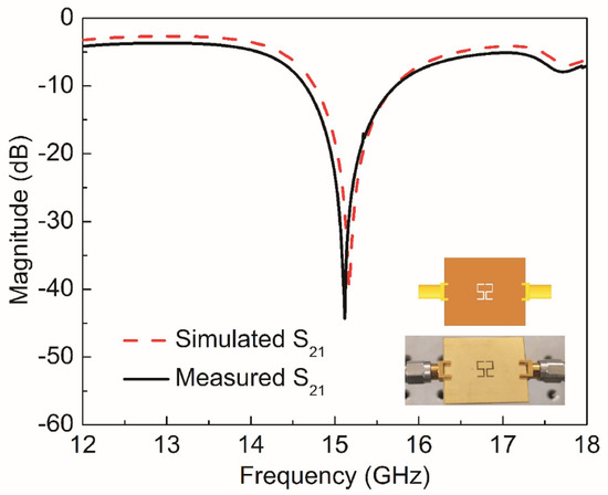 Magnitude of transmission (S21) coefficient for simulated and measured sensor based on CSSSR. Simulated resonance frequency is 15.17 GHz with notch depth of −39.84 dB while measured resonance frequency is 15.12 GHz with notch depth of −44.33 dB.