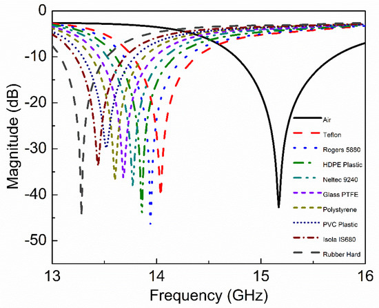 The CSSSR sensor is fabricated on commercially available 1.6 mm FR4 substrate using the standard photolithographic technique which is simple and inexpensive. To connect the sensor with the vector network analyzer (VNA AV3672C), a pair of high-precision subminiature version A (SMA) connectors are connected at both side of microstrip transmission line. The impedance, center contact resistance and insulation resistance of the SMA connecters are 50 Ω, ≤ 0.3 mΩ, ≥ 3000 MΩ respectively. The frequency range, resolution and accuracy of VNA AV3672C are 10 MHz~40 GHz, 1 Hz, ± 1 × 10-7 respectively. The fabricated prototype of the CSSSR sensor with SMA connectors and MUT is shown in Figure 11. The VNA AV3672C is calibrated using a 2.4 mm calibration kit (AV31123) with frequency sweep 12 GHz to 18 GHz, number of sweeping points 1601 and IF-bandwidth 100Hz. After calibration the transmission coefficient of the fabricated sensor is measured and plotted in Figure 12. The measured f0 of the fabricated sensor is 15.12 GHz with notch depth of −44.33 dB and the unloaded quality factor is 501. The difference between simulated and measured resonance frequency, notch depth and quality factor is 0.05 GHz, −4.49 dB and 4, respectively, which can be attributed to fabrication tolerance. To verify the sensitivity of fabricated sensor following low permittivity materials Teflon, Rogers RT5880, high density poly ethylene (HDPE) plastic, Netltec NX9240, glass polytetrafluoroethylene (PTFEreinf), polystyrene, polyvinyl chloride (PVC) plastic, Isola IS680-280, and Rubber Hard are selected. These MUTs are placed on the CSSSR and loaded resonance frequency of the sensor is calculated. Figure 13 shows the measured S21 of the sensor due to interaction with composite MUTs.