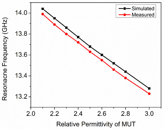 Equation (8) can predict the resonance frequency of the sensor due to interaction with an MUT with real relative permittivity ranges from 2.1 to 3. Equation (8) can be rearranged to calculate relative permittivity in the following form: