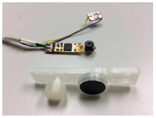 Several types of head-mounted devices are available for wearable eye trackers. It is necessary to place the camera close to the eyes to track eye movement (Figure 6). A device model with more space on the face was selected to avoid the eyes being too close to the light source and to increase the comfort. The camera module was placed under the eye to prevent the upper eyelid from obscuring the photographic line of sight. The placement angle affects the ratio of the image to the eye and the face and should be appropriate to capture a dark background.