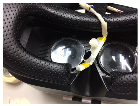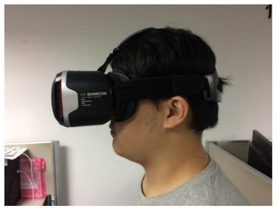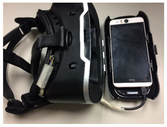 The camera module was attached to the center of the head-mounted device and finely adjusted according to the face of the user. As depicted in Figure 7, the phone was placed on the front phone slot and the camera cable was inserted into the micro USB connector of the phone. The phone slot was then closed. The user put on the device and adjusted the wearing position till he confirmed that he could see the blue safety range boundary of the screen.